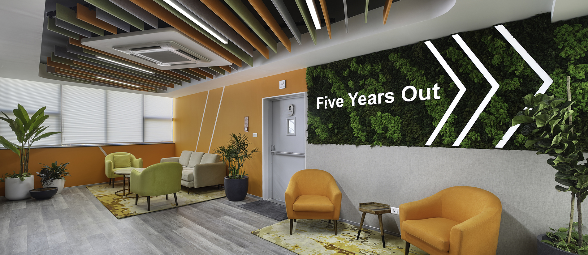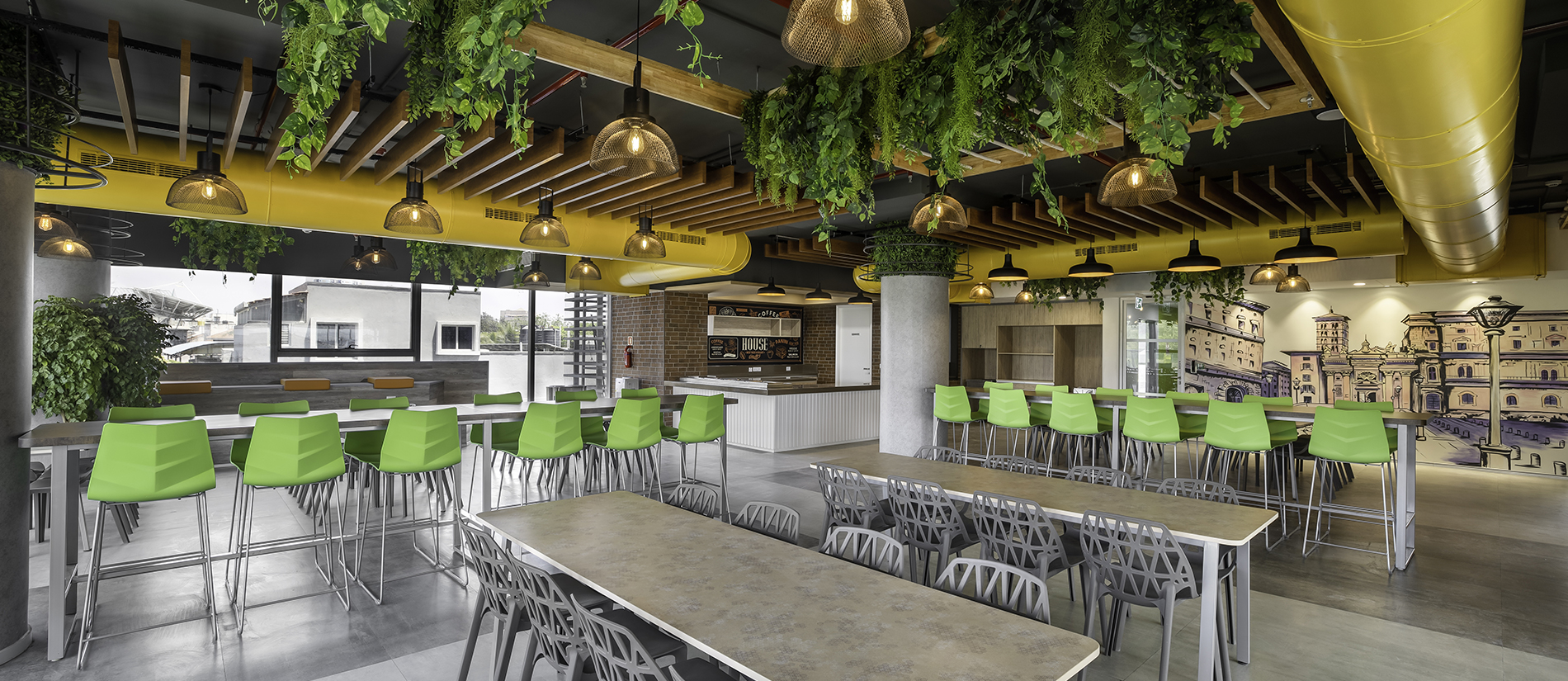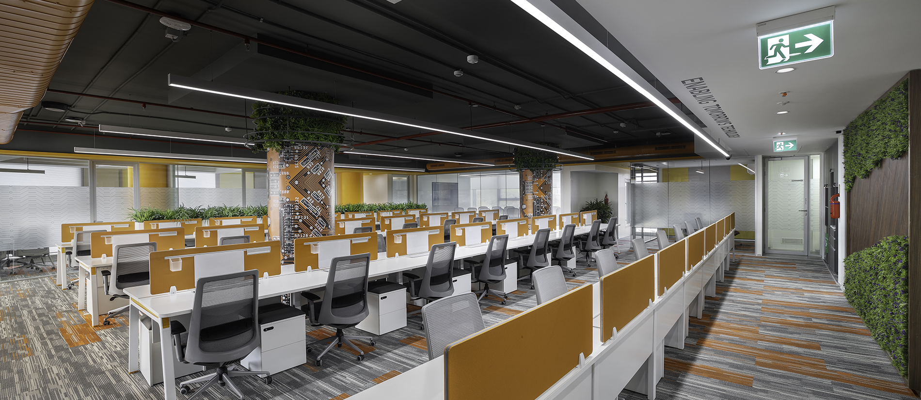 The project of Arrow Electronics posed a unique challenge as the building had 11 floors and most of the floors had a typical plan. Hence the design strategy was to create 'Differentiation' by use of colour. Hence each set of 2 floors was given a different theme. This was essentially an open plan office and cabins were replaced by meeting and conference rooms. The cafetaria was placed in the centre of the building, thus making it equally accessible from both the ground floor as well as the top floors. Innovative new products were used in this project including seating pods and phone booths.