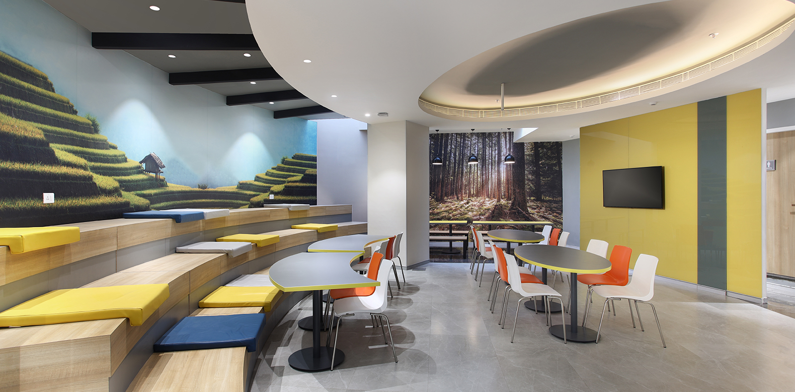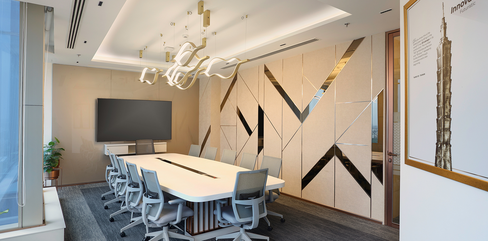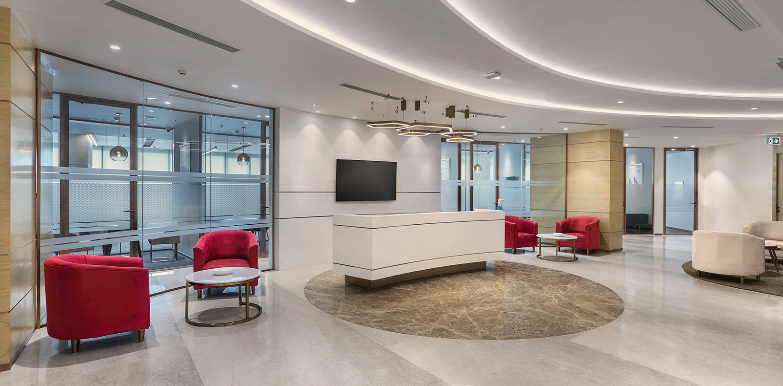 The corporate office for M3M SmartWorld, a collaboration of the luxury real estate firm M3M Group and Singapore based SmartWorld Developers reflects the client’s core vision of speed,class and innovation, and is designed as an ultra premium space with a sophisticated and luxurious hospitality-centric theme. The 8000 sft SmartWorld office on the 13th floor and the 3150 sft CRM office on the terrace both exemplify elegance and openness, while being grounded in functionality. Synergy designed the odd trapezium-shaped plan in such a way that almost all areas get maximum natural light.