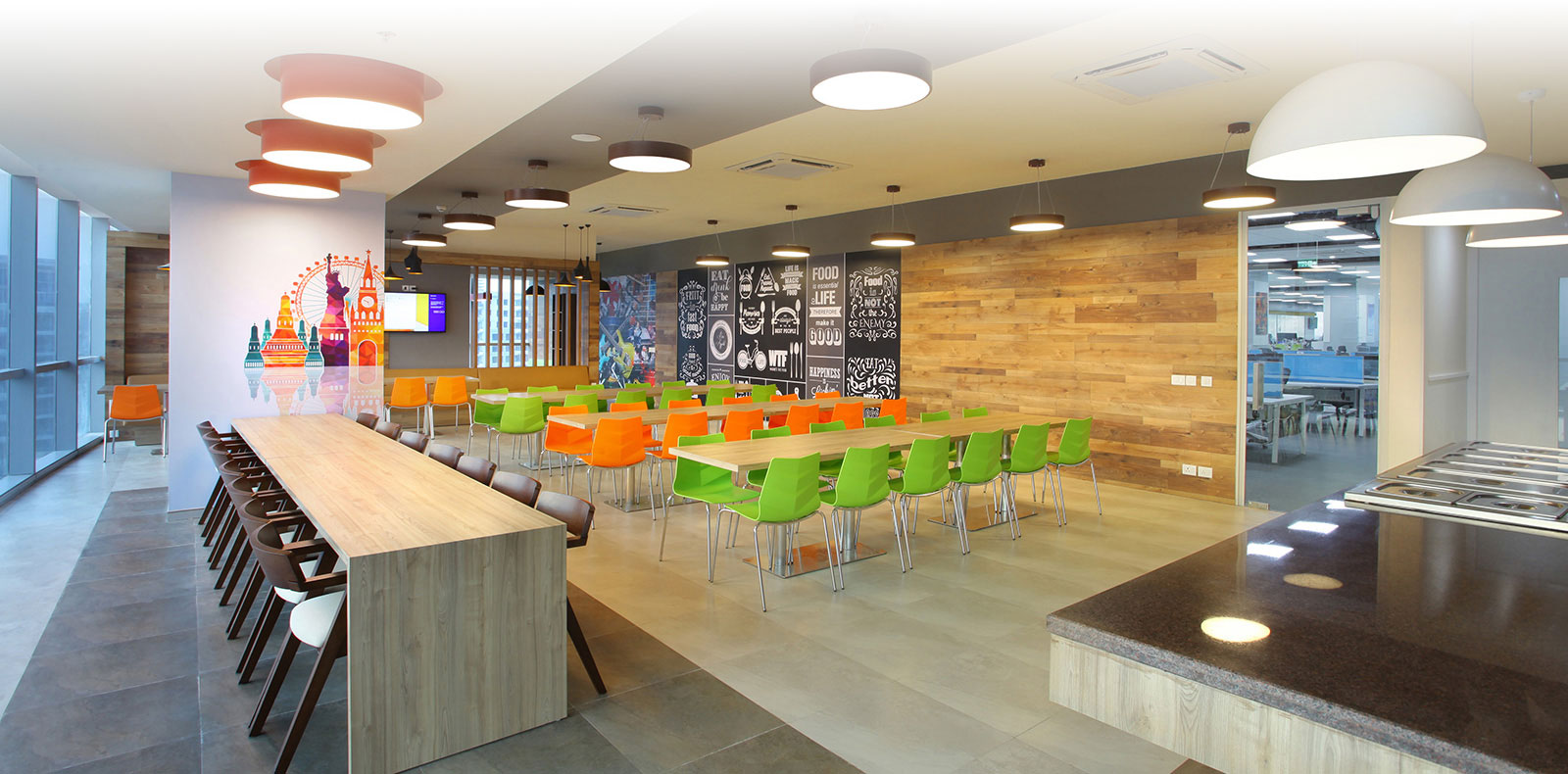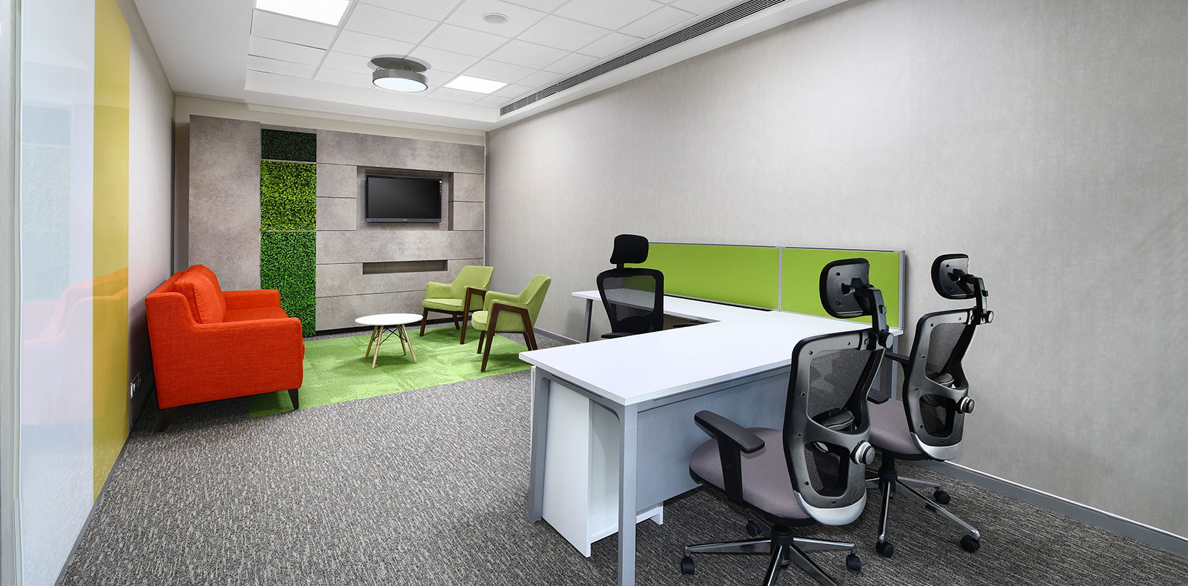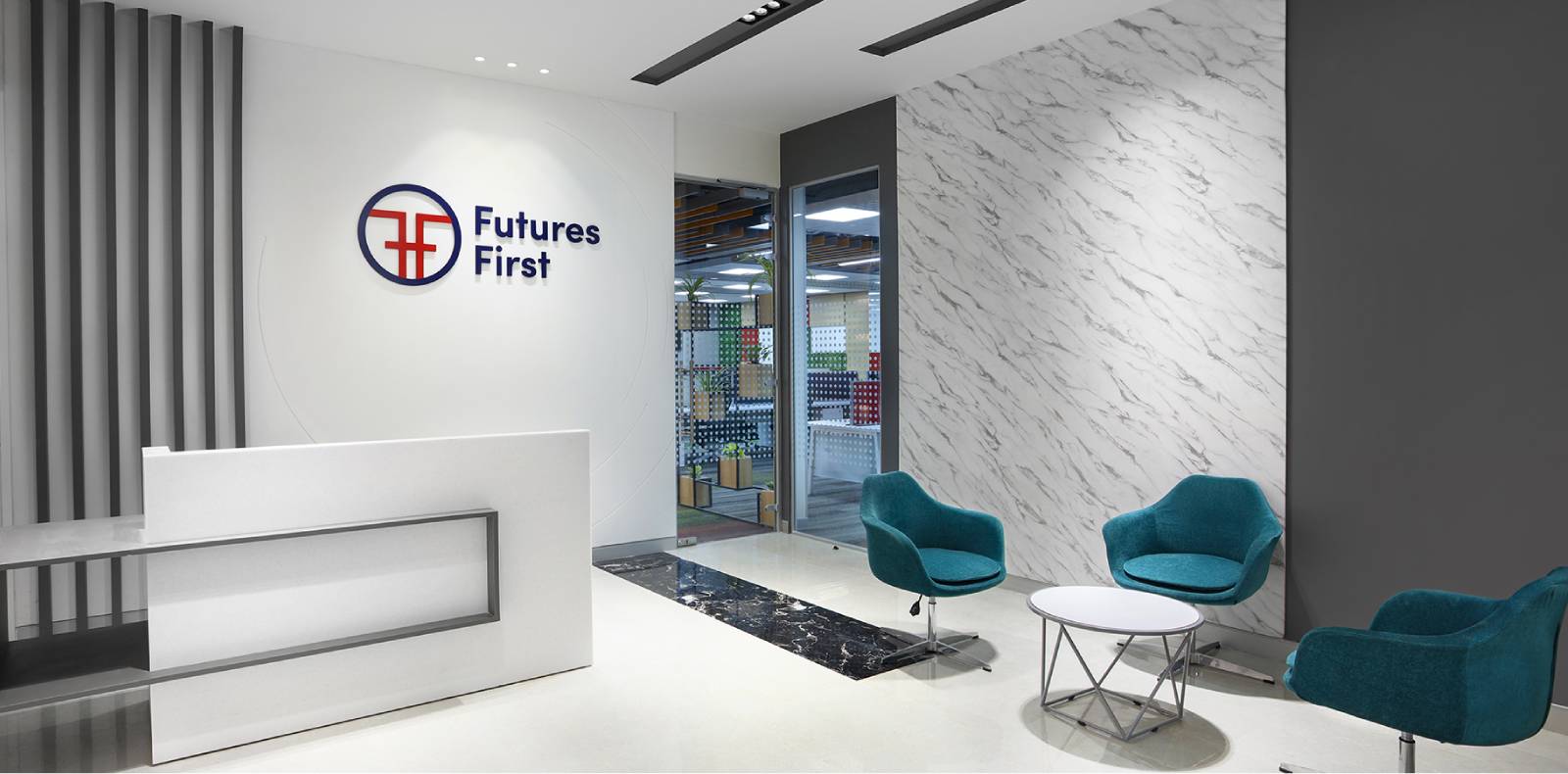 Futures First Info Services, is our client for over 10 years having done 12 projects in multiple locations including Delhi-NCR, Jaipur, Mumbai, Kolkata, Hyderabad & Bangalore. It is a London based firm, Trading in Commodities. The Corporate office is located on the Golf Course Road, Gurgaon in the premium DLF Horizon 2 building, with a carpet area of 16,000sft. The space has been designed as a modern and Premium office with chromatic colour scheme and given a fresh & youthful look. The concept was to create an energetic environment for the employees. Different materials were woven together as a whole to add texture and Visual appeal to the interior.